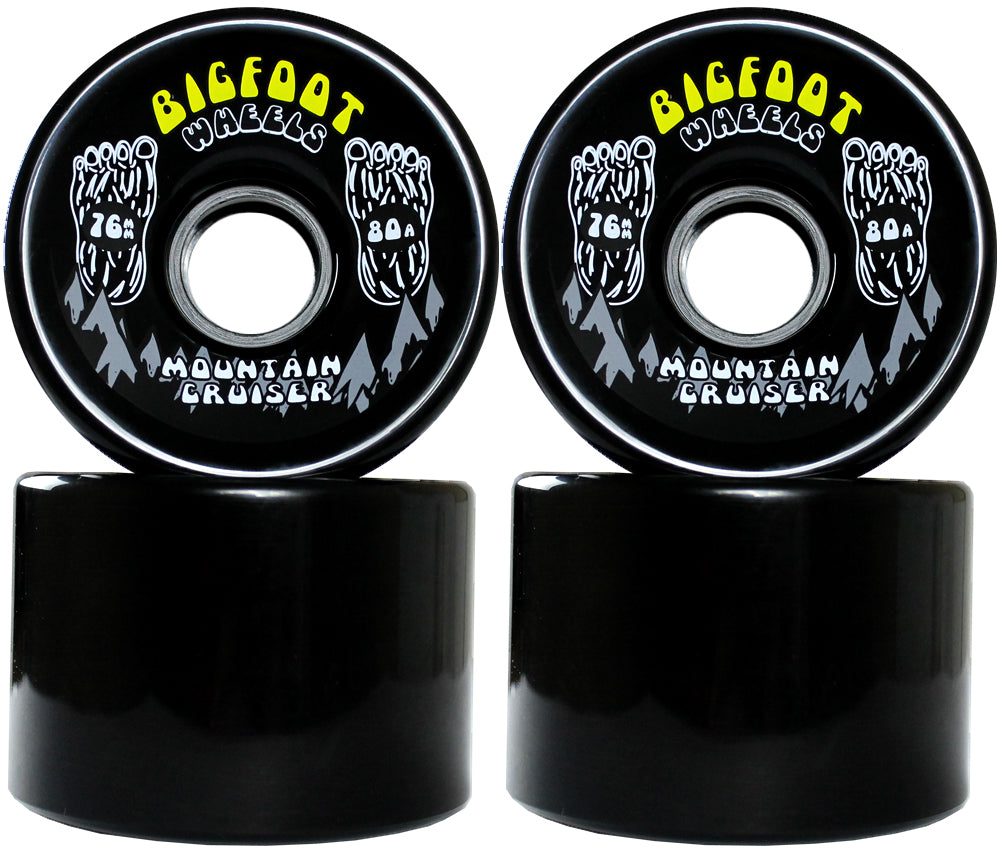 WHEELS: Bigfoot Mountain Cruisers offer a newly modified super high rebound formula. The latest innovations offer a super high rebound 80a durometer urethane and a slightly offset hub. Coming in at 76mm in diameter, 80a in hardness, and 53mm in width. Slightly offset hub with a 47.5mm contact patch, rounded slightly inner edge. All of these details put together equal a wheel with quick acceleration, smooth ride, good grip, with good slide characteristics (after the break-in period).