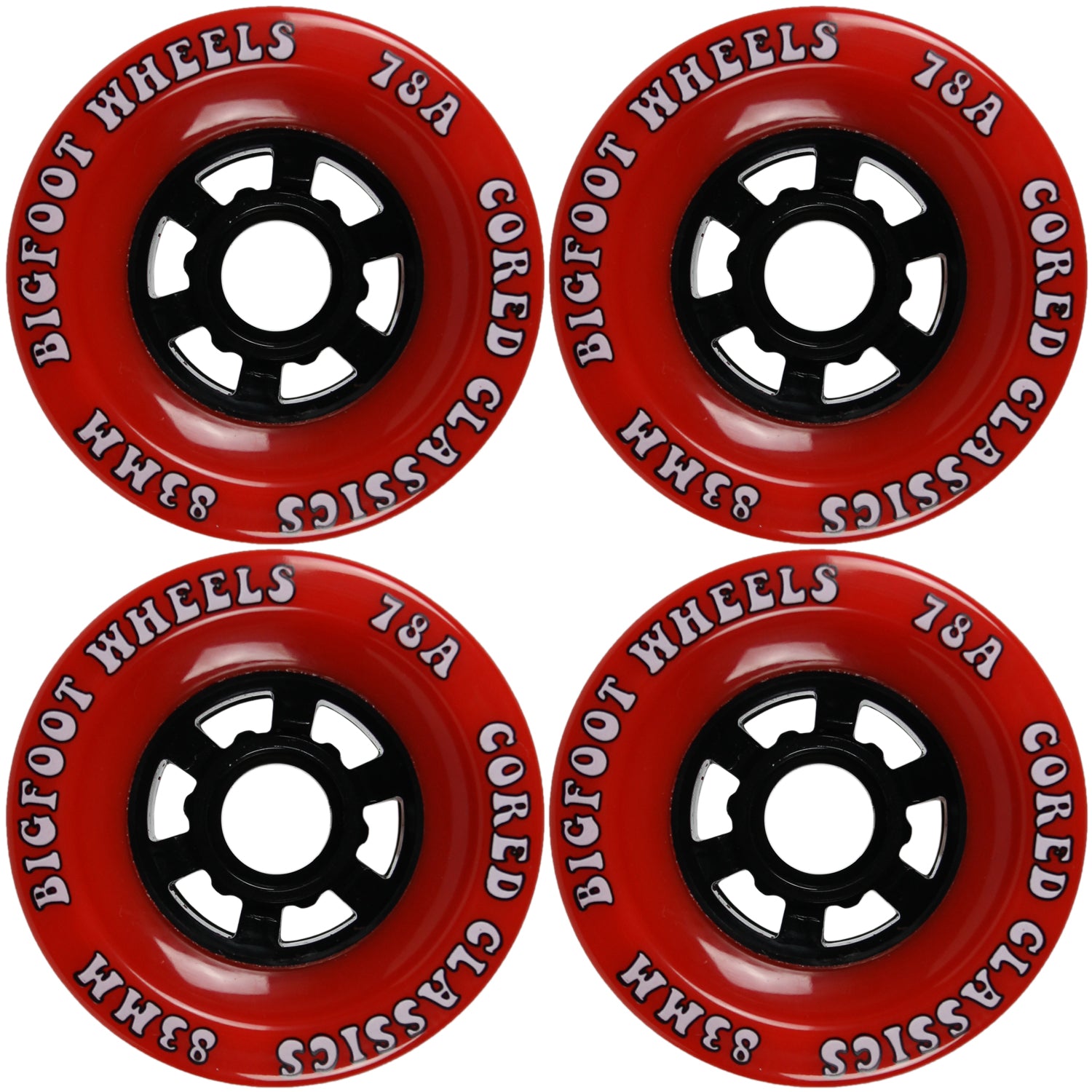 WHEELS: The newest series of Bigfoot is born to the need of skaters who just need bigger wheels. These wheels are especially good for drop trough and drop down shapes when you need extra clearance. Super High Rebound combined with strong spoked cores make the Bigfoot Cored Classics a must for big wheel riders. Center Set Bearing Hub with a 78A Durometer. Measures 83mm x 52mm.