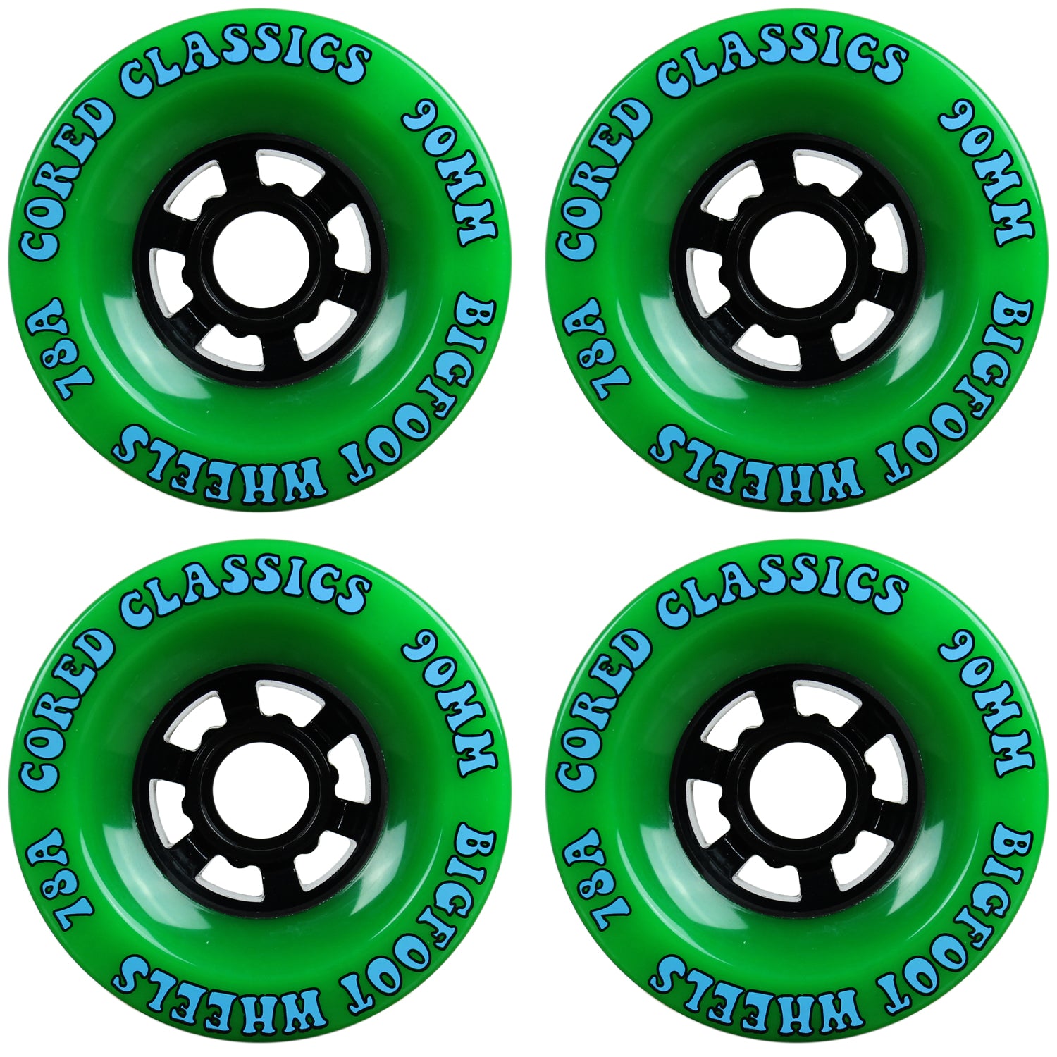 WHEELS: The newest series of Bigfoot is born to the need of skaters who just need bigger wheels. These wheels are especially good for drop trough and drop down shapes when you need extra clearance. Super High Rebound combined with strong spoked cores make the Bigfoot Cored Classics a must for big wheel riders. Center Set Bearing Hub with a 78A Durometer. Measures 90mm x 53mm.