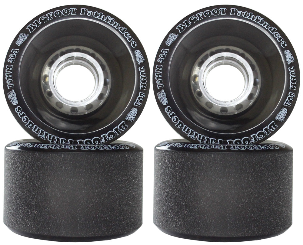 WHEELS: The Bigfoot Pathfinders come in at 70mm x 45mm with a 39mm contact patch. Poured with the latest 80a SHR formula. Featuring a stone-ground contact patch with a center-set clear hub & acute angled lips. Our R&D team put these wheels together for freeriding and sliding!