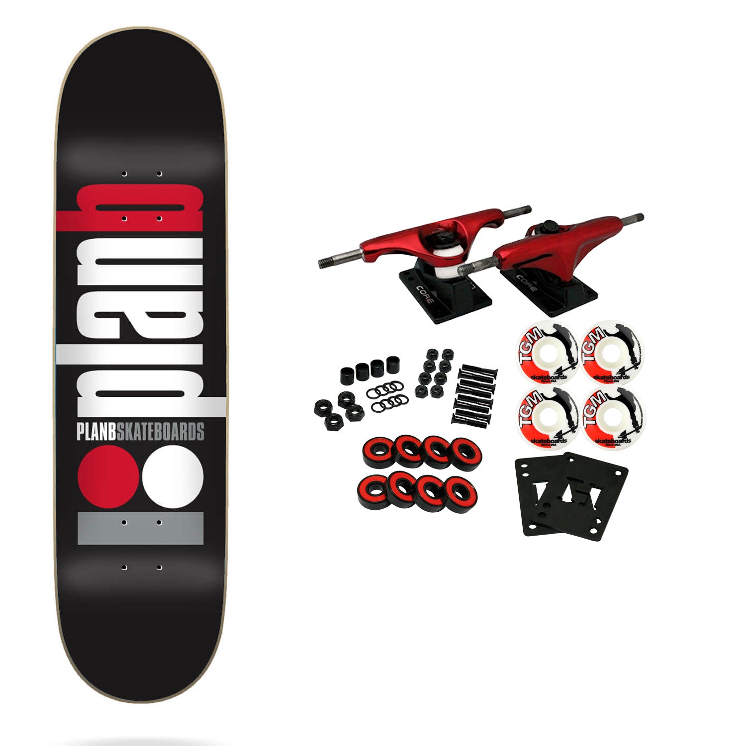 Plan B wood comes exclusively from forest conservation areas in Canada. This board measures 8.25" x 32.125". Comes with Core trucks, 52mm TGM logo wheels, Amphetamine abec 5 bearings, Black Diamond Griptape, risers, and hardware. Core trucks are light weight and feature heavy duty aluminum with grade 8 steel kingpins and axles, as well as USA made bushings and pivot cups. 52mm 99A are the perfect wheels for both street and park skating. Like the name states, Amphetamine bearings are stimulants for your wheels! Light synthetic oil, Delrin Crowns, and Rubber Serviceable Shields are a few of the things that makes these bearings one of the best Abec 5 rated bearings on the market. Arrives un-assembled which allows for customization and a feeling of accomplishment. Skaters love building their boards! Easy to assemble!