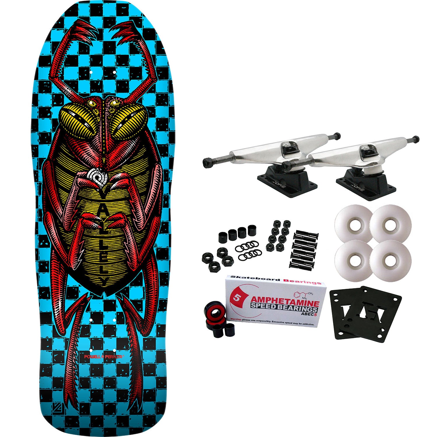 Powell-Peralta re-issue decks are close reproductions of their 1980’s counterparts, featuring the original Pro graphics and shape, top graphic logo and concave. Measures 9.85" x 30" with a 15" wheelbase. Complete includes 7.0 Core Trucks, 58mm Wheels, Amp Abec 5 Bearings, Black Diamond Griptape, hardware and risers.