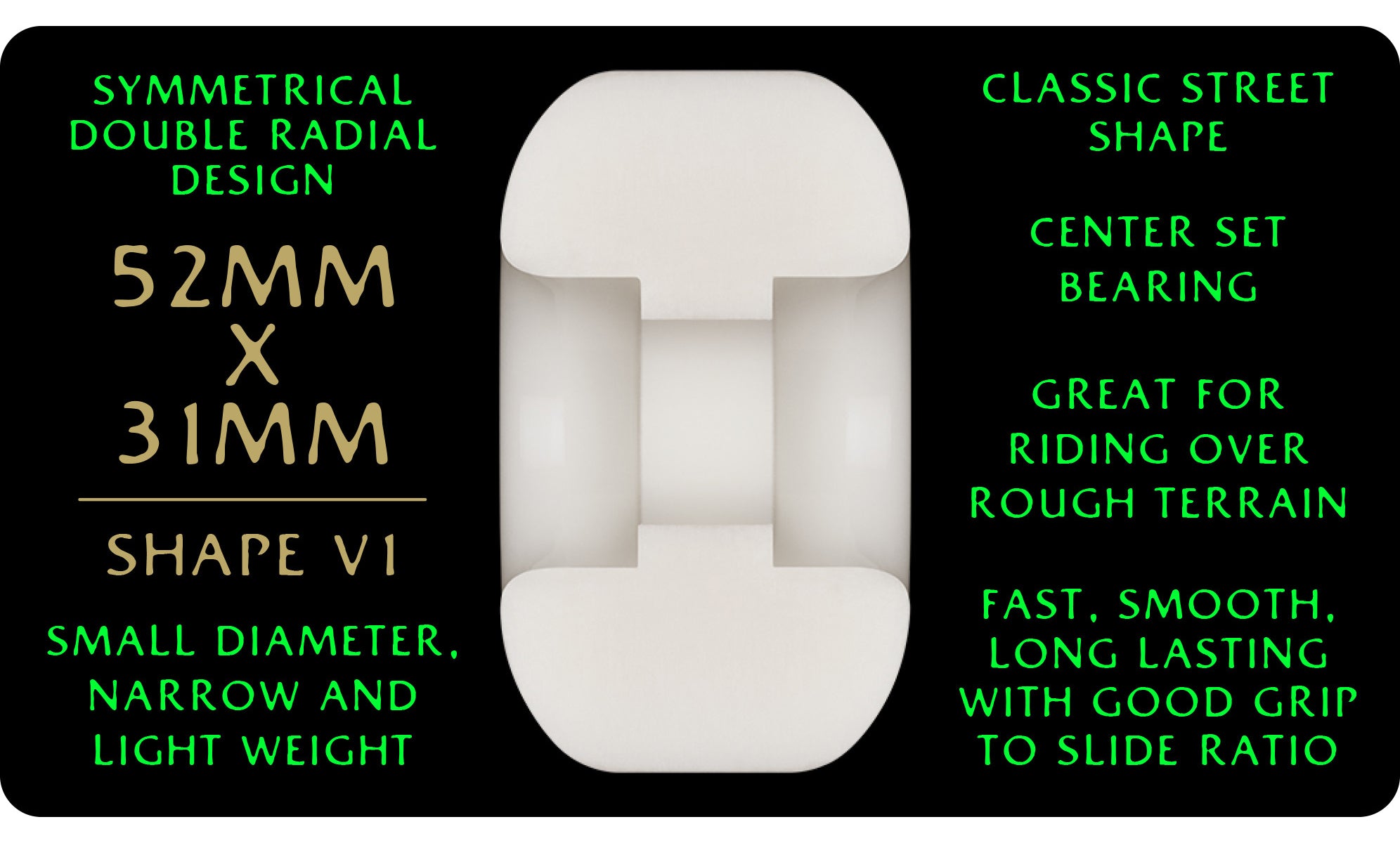 ABOUT THE V1 SHAPE: Symmetrical double radial design. Classic street shape. Small diameter, narrow and light weight. Center set bearing.