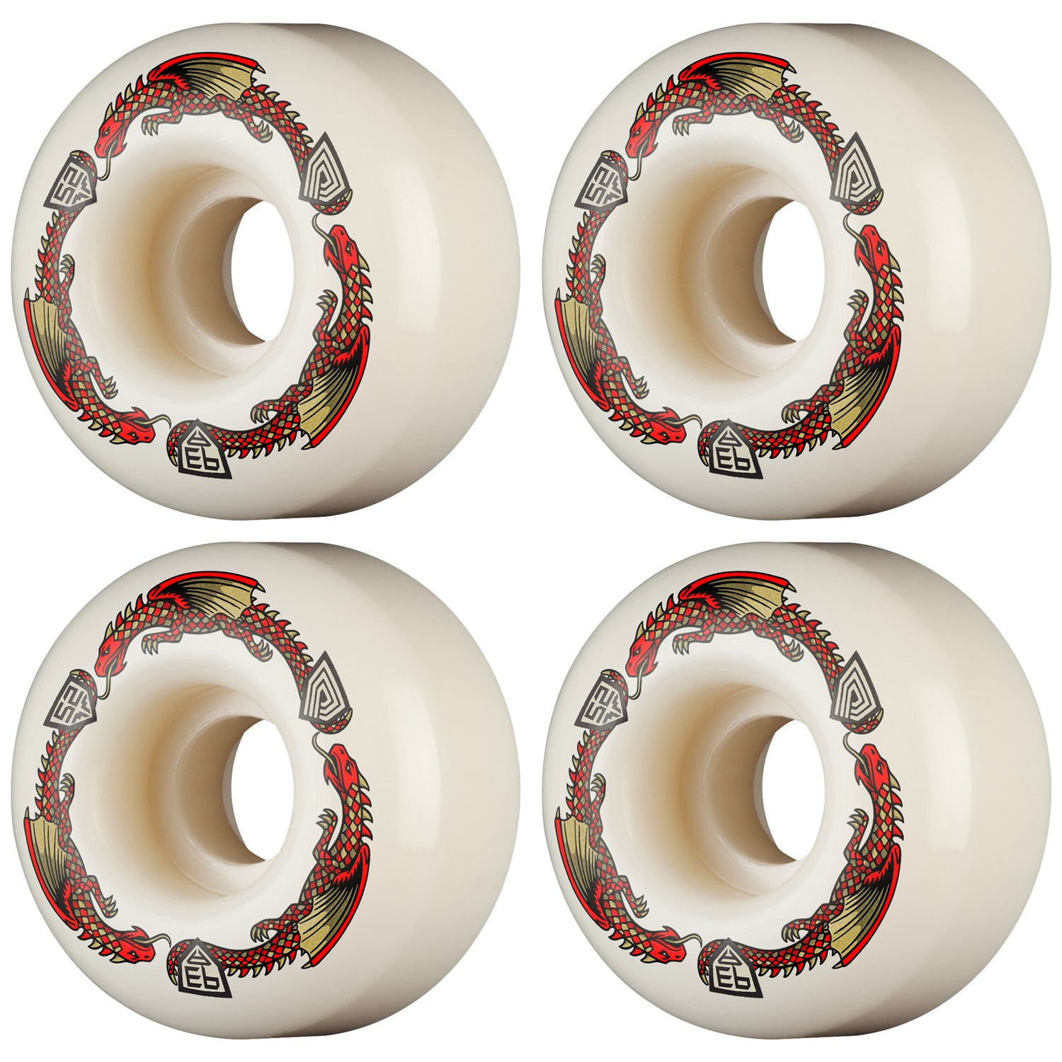 93A Dragon Formula: The amazing Dragon Formula (DF) Urethane used to create these wheels is another industry leading innovation from Powell Peralta. DF-93A Dragons will not only roll over rough terrain, but also grip and slide like 99A and 101A wheels do, so that you can do all your normal tricks and more on the greater range of skate terrains made skateable by its softer 93A hardness. Dragons are very fast because DF-93A is super high rebound, an industry leading 18-20% higher than hard wheels. This higher rebound means you won’t lose speed in bowls or parks the way you would with an ordinary 93A wheel, and you will roll much smoother and faster on rough streets and sidewalks. Dragons slide on both rough and smooth terrain, when you need it. This is because Dragon Formula is not a normal urethane formulated to be a mid-90's wheel, it is a unique formulation developed by our R&D group over a 10 year period to optimize and fine tune it to perfection. Dragon Formula wheels are not only smooth, fast, and slidable, they are also among the longest lasting wheels available. This makes them a super value at the same time, so don’t think you are saving money by buying a low cost, low performance wheel. Choose Dragon Formula wheels, and have more fun skating longer.