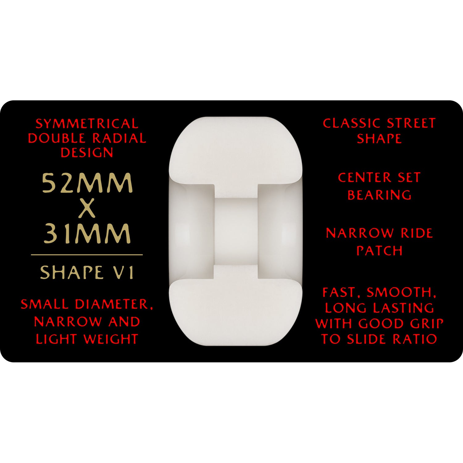 ABOUT THE V1 SHAPE: Symmetrical double radial design. Classic street shape. Small diameter, narrow and light weight. Center set bearing.