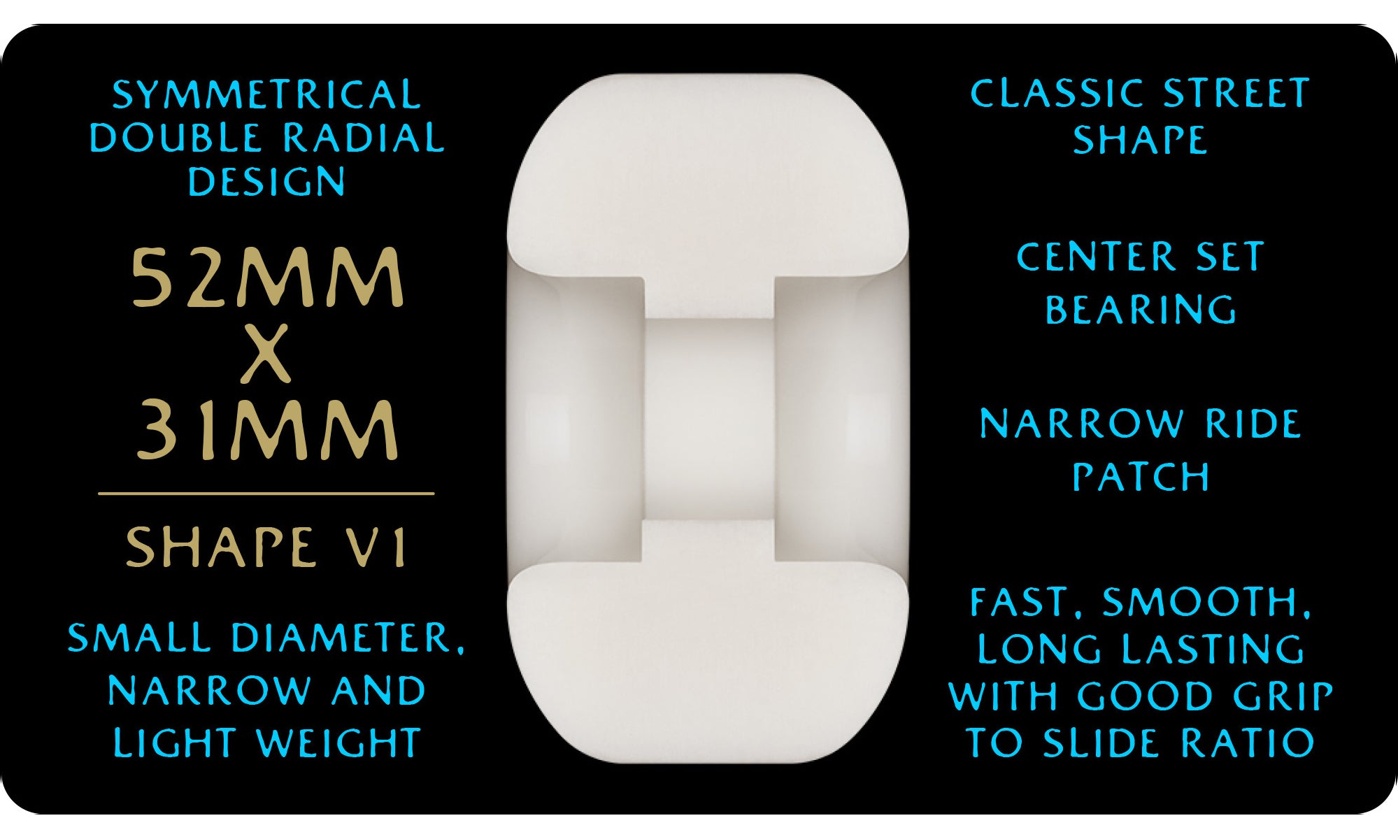 ABOUT THE V1 SHAPE: Symmetrical double radial design. Classic street shape. Small diameter, narrow and light weight. Center set bearing.