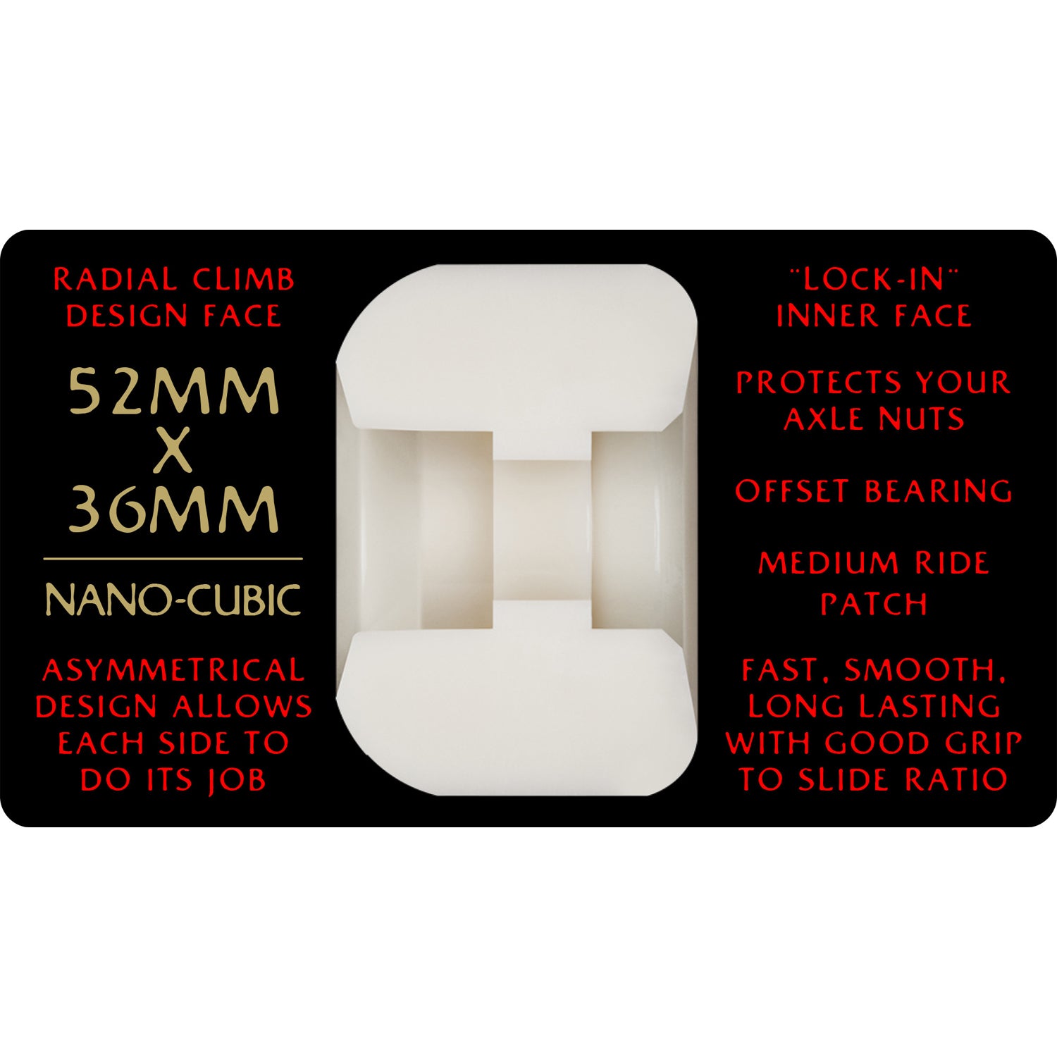 NanoCubics are inspired by and developed for Andy Anderson to help him expand his wide range of street, park and freestyle tricks on all terrains. NanoCubics feature the same classic design advantages, of the legendary Cubic and MiniCubic, reconceived for today's skating, and utilizing a special version of our amazing new Dragon formula. The NanoCubic's offset design allows it to have the perfect shape for both inner and outer edges to skate a wider range of obstacles. NanoCubics are smaller, lighter, and offset, so their large outer edge rolls up curbs, walls, and over cracks, and it covers your axle and nuts. The inner edge locks onto rails but releases when you need to.