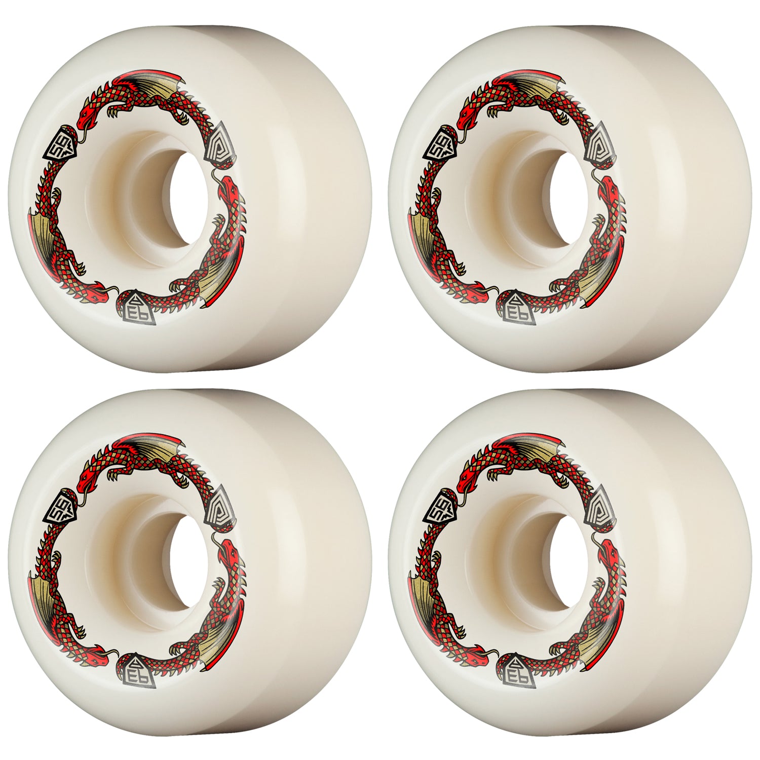 93A Dragon Formula: The amazing Dragon Formula (DF) Urethane used to create these wheels is another industry leading innovation from Powell Peralta. DF-93A Dragons will not only roll over rough terrain, but also grip and slide like 99A and 101A wheels do, so that you can do all your normal tricks and more on the greater range of skate terrains made skateable by its softer 93A hardness. Dragons are very fast because DF-93A is super high rebound, an industry leading 18-20% higher than hard wheels. This higher rebound means you won’t lose speed in bowls or parks the way you would with an ordinary 93A wheel, and you will roll much smoother and faster on rough streets and sidewalks. Dragons slide on both rough and smooth terrain, when you need it. This is because Dragon Formula is not a normal urethane formulated to be a mid-90's wheel, it is a unique formulation developed by our R&D group over a 10 year period to optimize and fine tune it to perfection. Dragon Formula wheels are not only smooth, fast, and slidable, they are also among the longest lasting wheels available. This makes them a super value at the same time, so don’t think you are saving money by buying a low cost, low performance wheel. Choose Dragon Formula wheels, and have more fun skating longer.