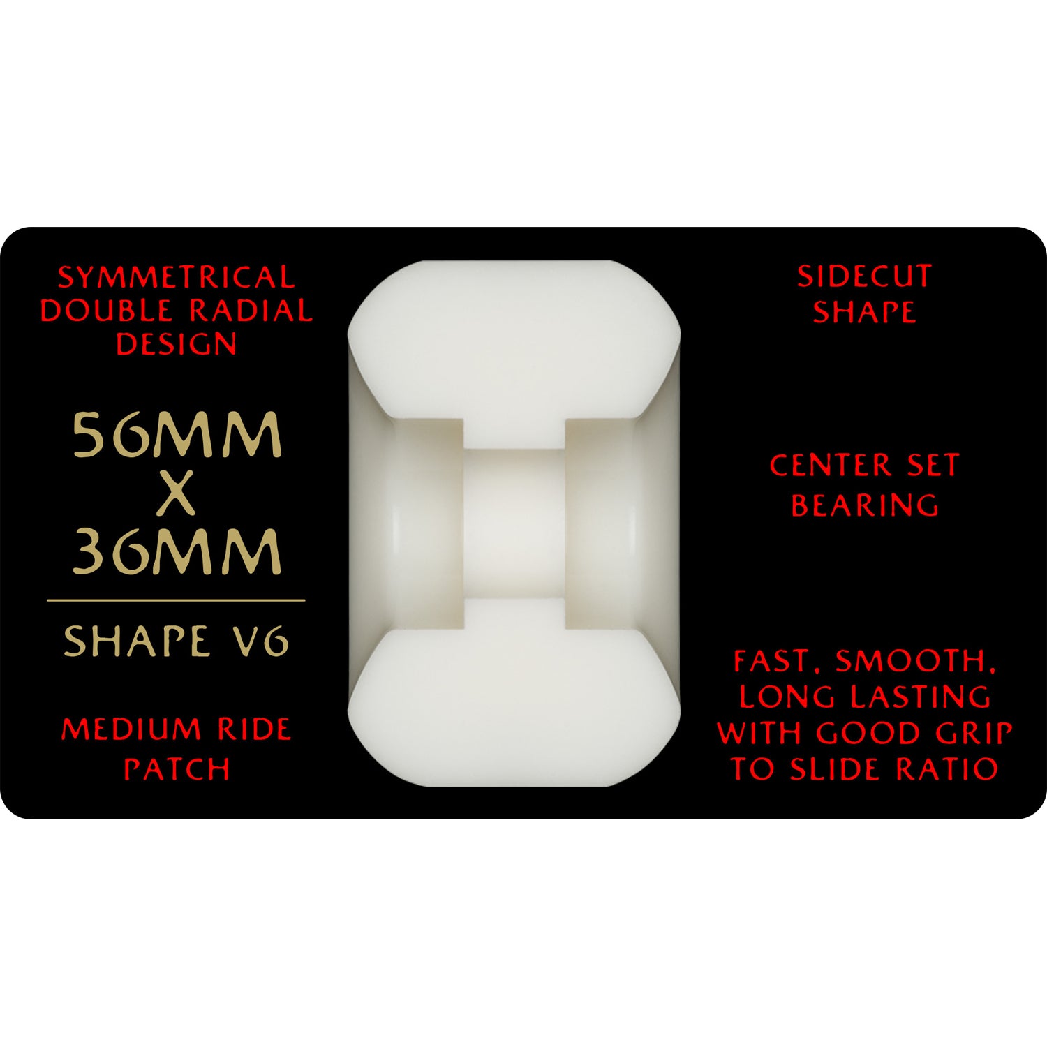 ABOUT THE V6 SHAPE: Symmetrical double radial design. Sidecut shape. Medium ride patch. Center set bearing.