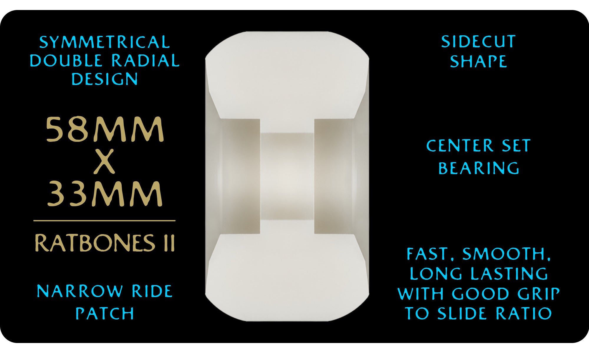 The Ratbones II shape is symmetrical and features a narrow ride patch and smooth wheel surface.