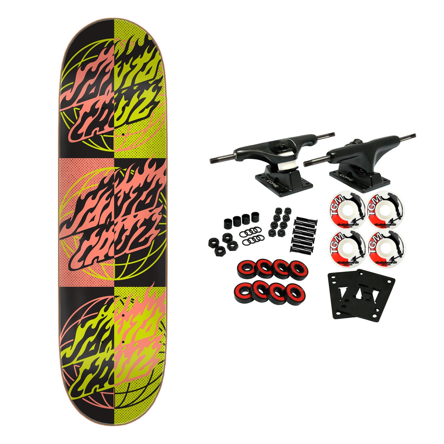 Core trucks are light weight and feature heavy duty aluminum with grade 8 steel kingpins and axles, as well as USA made bushings and pivot cups. 52mm 99A are the perfect wheels for both street and park skating.