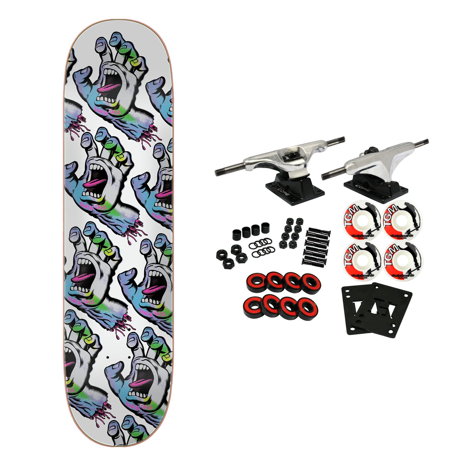 Santa Cruz Skateboards Holo Screaming Hand 7 Ply deck with multi-color spot gloss graphic. 7 ply northern hardwood deck pressed using specially designed crosslinked glue Creating a responsive and durable deck at an affordable price. Measures 8.0" x 31.6" with a 14.22" wheelbase. Comes with Core trucks, 52mm TGM logo wheels, Amp abec 5 bearings, Black Diamond Griptape, risers, and hardware. Core trucks are light weight and feature heavy duty aluminum with grade 8 steel kingpins and axles, as well as USA made bushings and pivot cups. 52mm 99A are the perfect wheels for both street and park skating. Like the name states, Amp bearings are stimulants for your wheels! Light synthetic oil, Delrin Crowns, and Rubber Serviceable Shields are a few of the things that makes these bearings one of the best Abec 5 rated bearings on the market. Arrives un-assembled which allows for customization and a feeling of accomplishment. Skaters love building their boards! Easy to assemble!