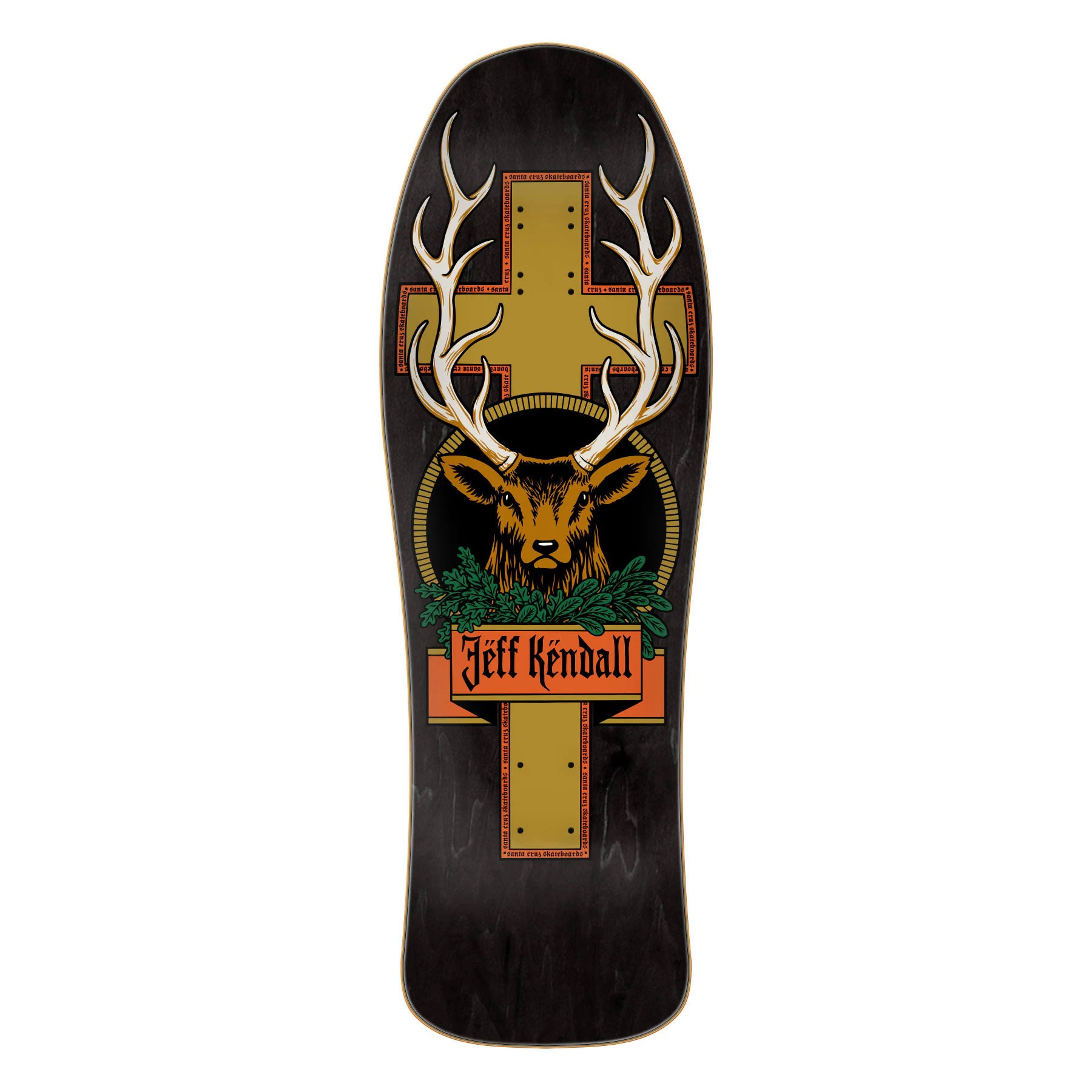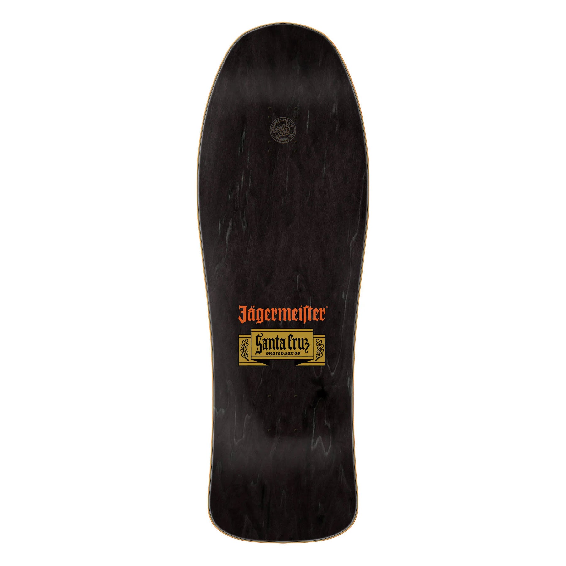 Santa Cruz Skateboards Jeff Kendall Jagermeister Reissue deck featuring spott matte and metallic OG graphics on black stained veneers and fully authorized Santa Cruz X Jagermeister top graphic with top laser etched reissue logo. Measures 10.18" x 30.99".