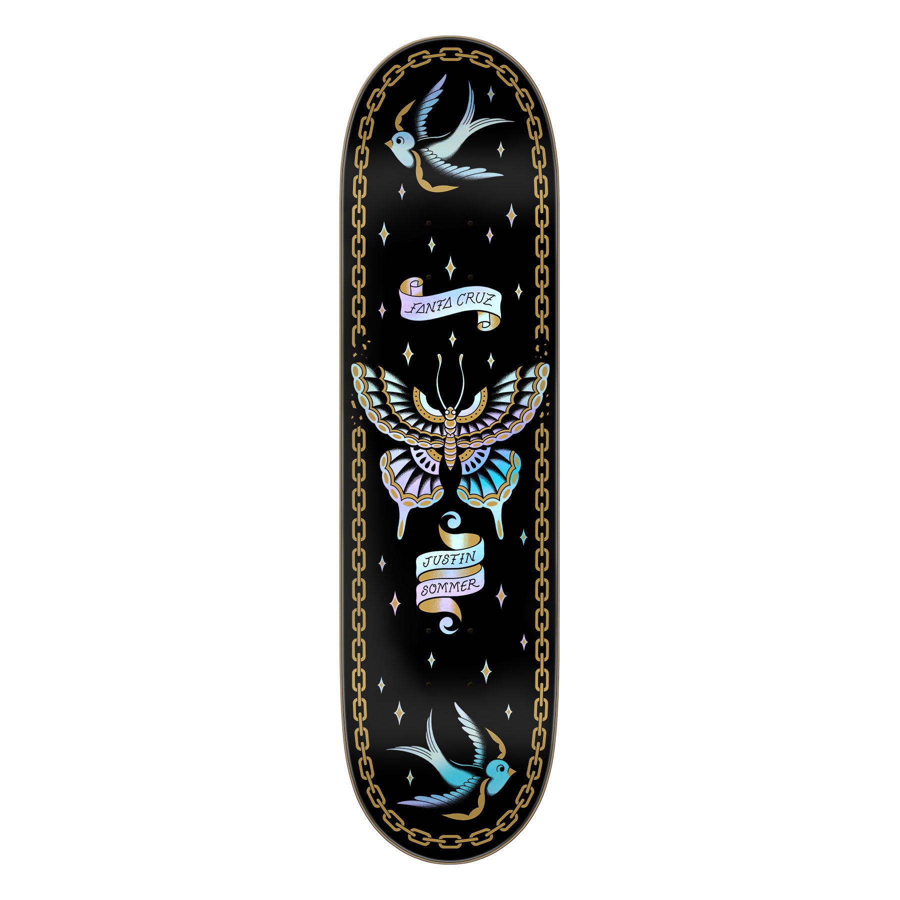 Santa Cruz Skateboards Justin Sommer Butterfly Pro Deck featuring rainbow prismatic foil and spot gloss graphics with an all new 8"shape with 13" wheelbase and new ATV-S concave "” custom designed for small body types. 7 ply North American Maple pressed individually using epoxy - making a strong, responsive deck with long lasting pop and consistent concave and kick. ATV-S is a universal medium-depth concave for smaller body types. Featuring symmetrical nose and tail kick, ATV-S performs well in all terrains on a wide variety of shapes with wheelbases between 12.75-13-75".