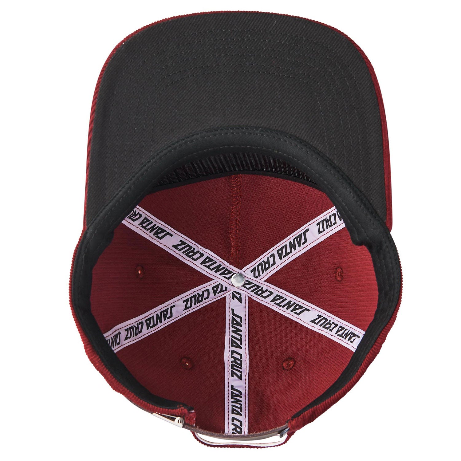 The new Santa Cruz Screaming Wave mid profile 5 panel unstructured corduroy hat features woven label patch with merrowed edge Santa Cruz Screaming Wave logo, mesh stay, loop label at rear strap back adjuster and custom interior taping.