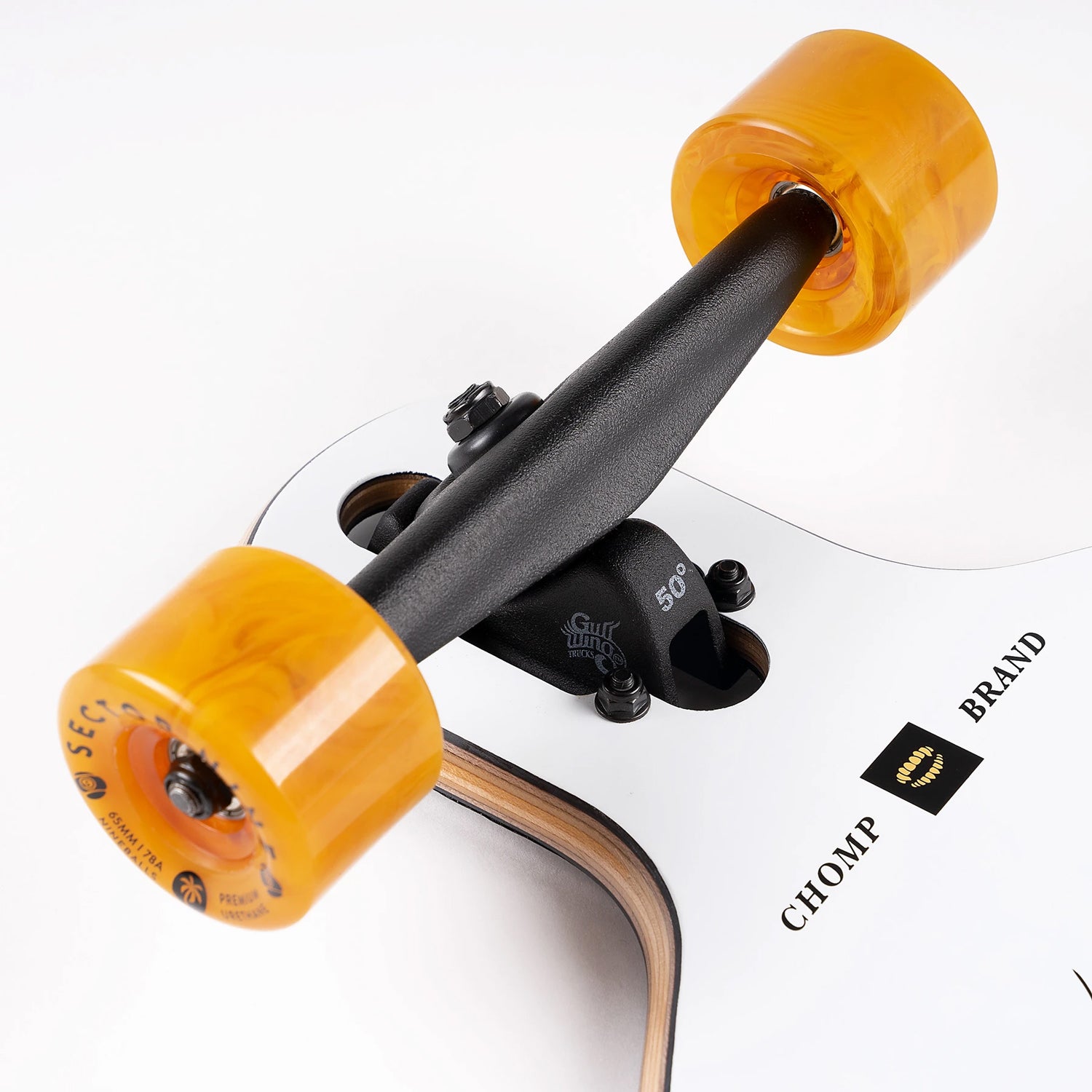 FEATURES: 8 Ply Maple, Flat Matte Bottom Artwork, Cloudy Swirled Wheels, Printed Grip Tape, Sharp Rails for Extra Grip and Control, Drop Thru, Collaboration with Chomp Brand.