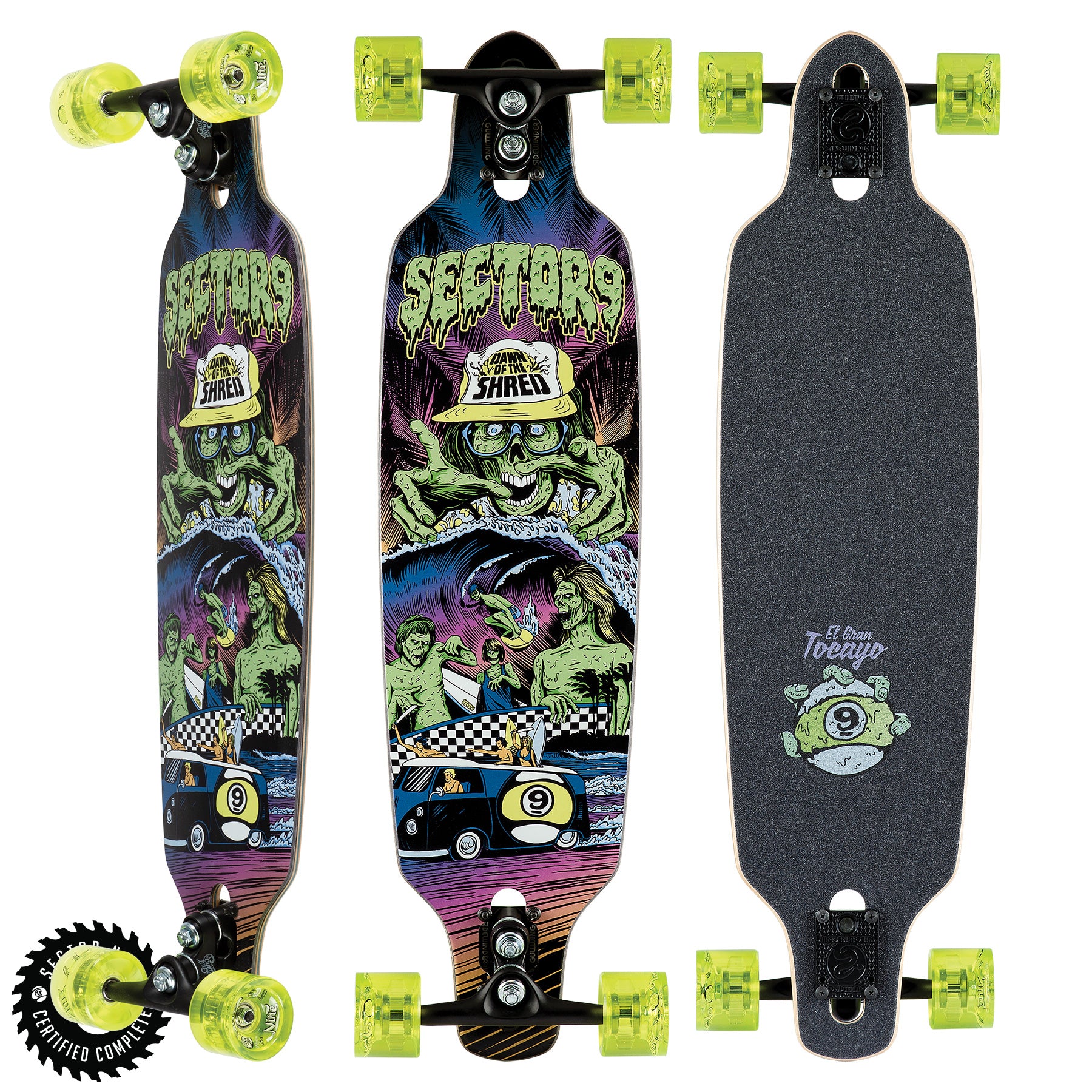 Sector 9 is proud to introduce our latest Artist Series line of boards. El Gran Tocayo is a self-taught illustrator, muralist, and all around badass. He's been immersed in the Action Sports Industry for over a decade, as both a professional artist and an as an active participant. We're lucky enough to have his "killer" zombie-inspired graphics grace the bottom of some of our most popular shapes, suited for just about any style of riding. Features 7 Ply Maple, Drop Thru, Art by El Gran Tocayo. Length: 34.0", Width: 8.75", Wheelbase: 24.4". Components 9.0" Gullwing Sidewinder II Trucks, 69mm 78a Nineballs, ABEC 5 Greaseball Bearings, 1.125" Truss Head Steel Bolts, ERG Grip Tape.