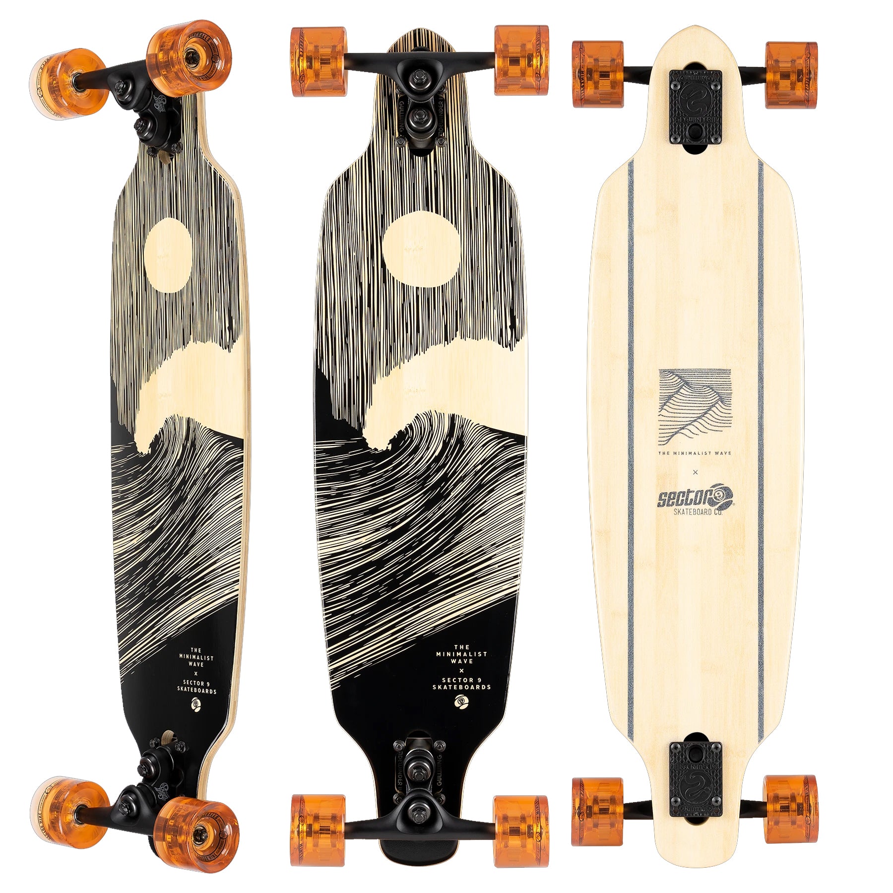 Sector 9 has decided to once again partner on an artistic collaboration for a Bamboo Collection with French artist, The Minimalist Wave. Following a ritual process, he obsesses over the patterns of a wave crossing the ocean, as it evolves constantly. A traditionalist artist utilizing pen and ink for his drawings, his work is an invitation to find yourself in the heart of the ocean, to get lost and to discover imaginary worlds. The simple black, minimalist illustrations provide a beautiful contrast to the natural Bamboo plies, creating decks worthy of hanging in a gallery just as much as they are riding to the beach. Board measures 8.7" x 33.5" with a 24.25" wheelbase. Built with 9.0" Gullwing Sidewinder II Trucks, 69mm 78a Nineballs wheels, Abec 5 Greaseball Bearings, 1.125" Truss Head Steel Bolts, Clear Grip.