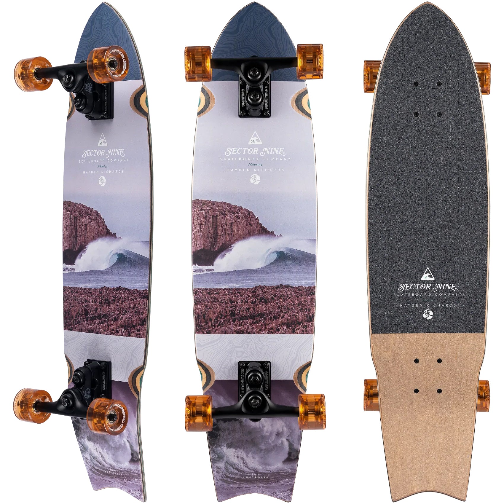 RIDING STYLE: Carving, Commuter, Cruiser. DIMENSIONS: Length: 34.5", Width: 8.75", Wheelbase: 17.25". FEATURES: 7 Ply Maple, Flat Matte Bottom Artwork, Clear Grip on Tail Over Exposed Dyed Maple, Printed Regular Grip Over Nose, Kicktail, Photography by Hayden Richards. COMPONENTS: 9.0" Gullwing Sidewinder II Trucks, 58mm 78a Nineballs, ABEC 5 Greaseball Bearings, 0.25" Recycled Plastic Risers, 1.25" Hardened Steel Bolts, Clear & Regular Grip Tape Mix.