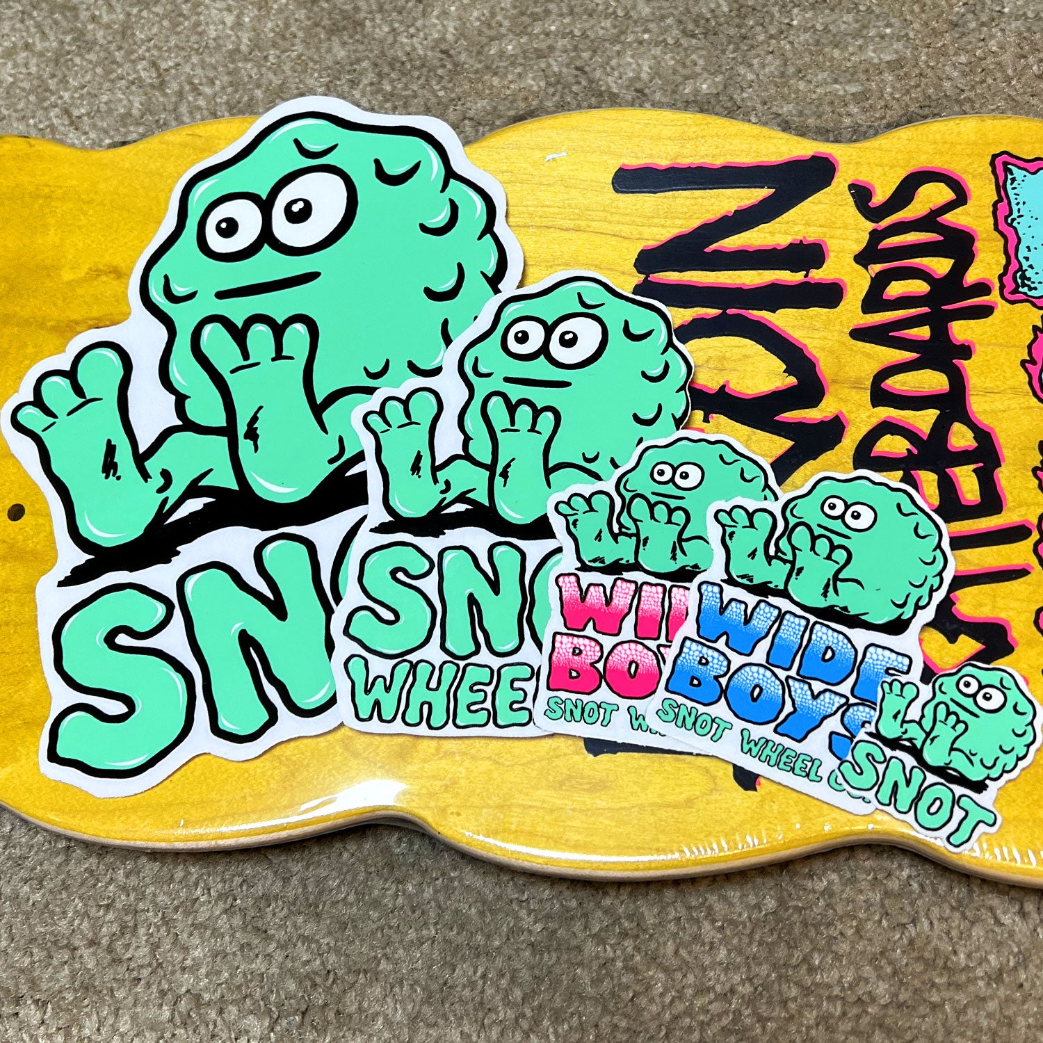 Includes 5 Stickers from Snot Wheel Co. Includes 1 Small, 1 Medium, and 1 Large Booger logo, and 2 Wide Boys Stickers.