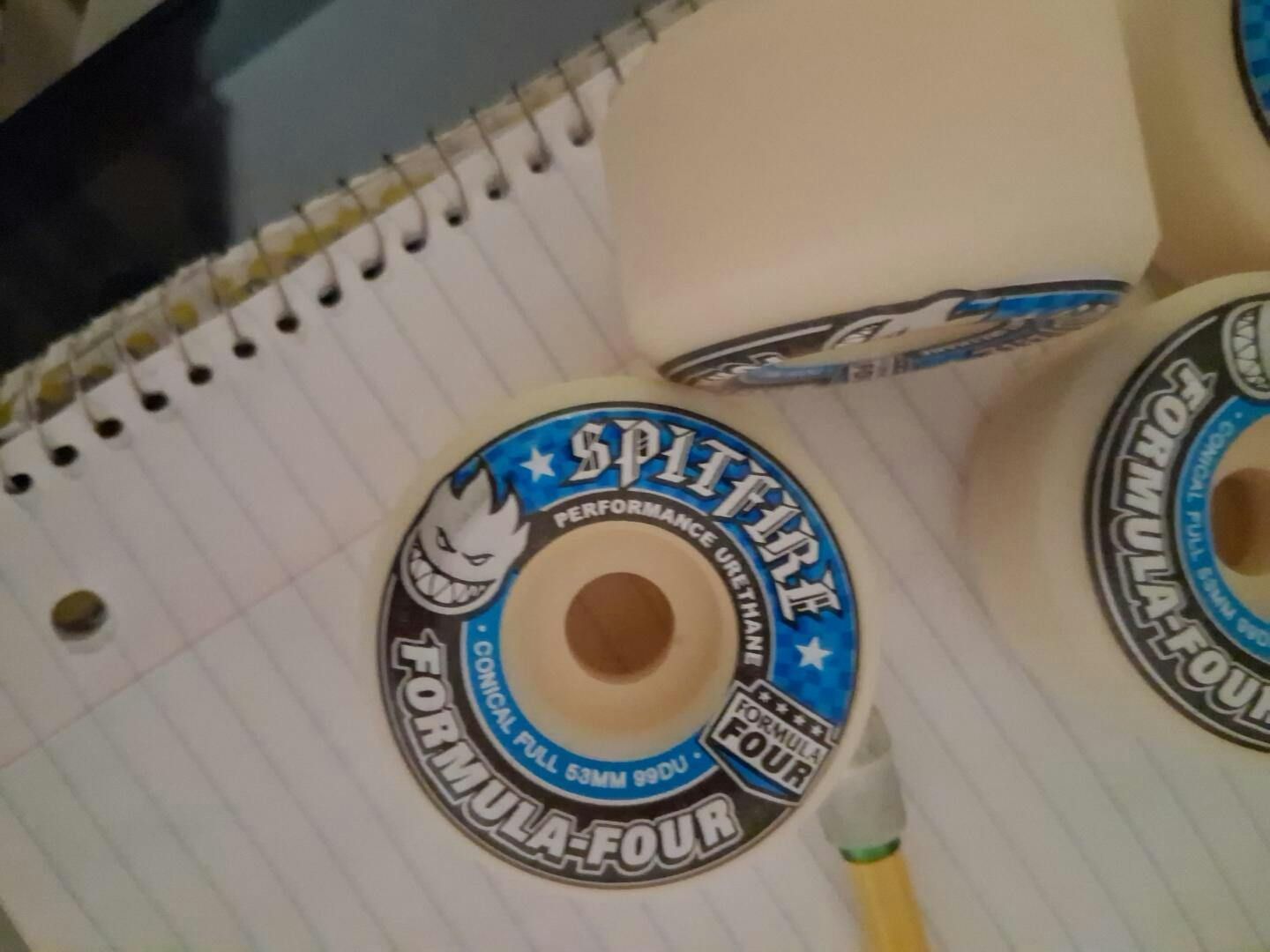 Spitfire Wheels Formula Four. 99A Durometer, 53mm x 33.5mm. Conical Full Shape. Wider riding surface and cutaway design for unmatched control and lasting speed everywhere.