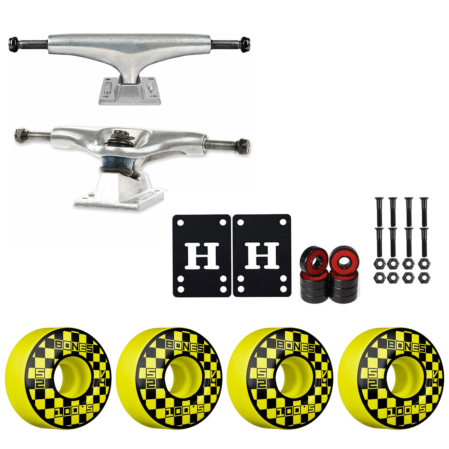 This package contains everything you need to make your deck a complete. Includes a set of Standard Polished Thunder Trucks, Bones 100's Wheels, Amp Abec 5 Bearings, 1" Hardware, and 1/8" Riser pads. Just add a deck and griptape and you are ready to ride!