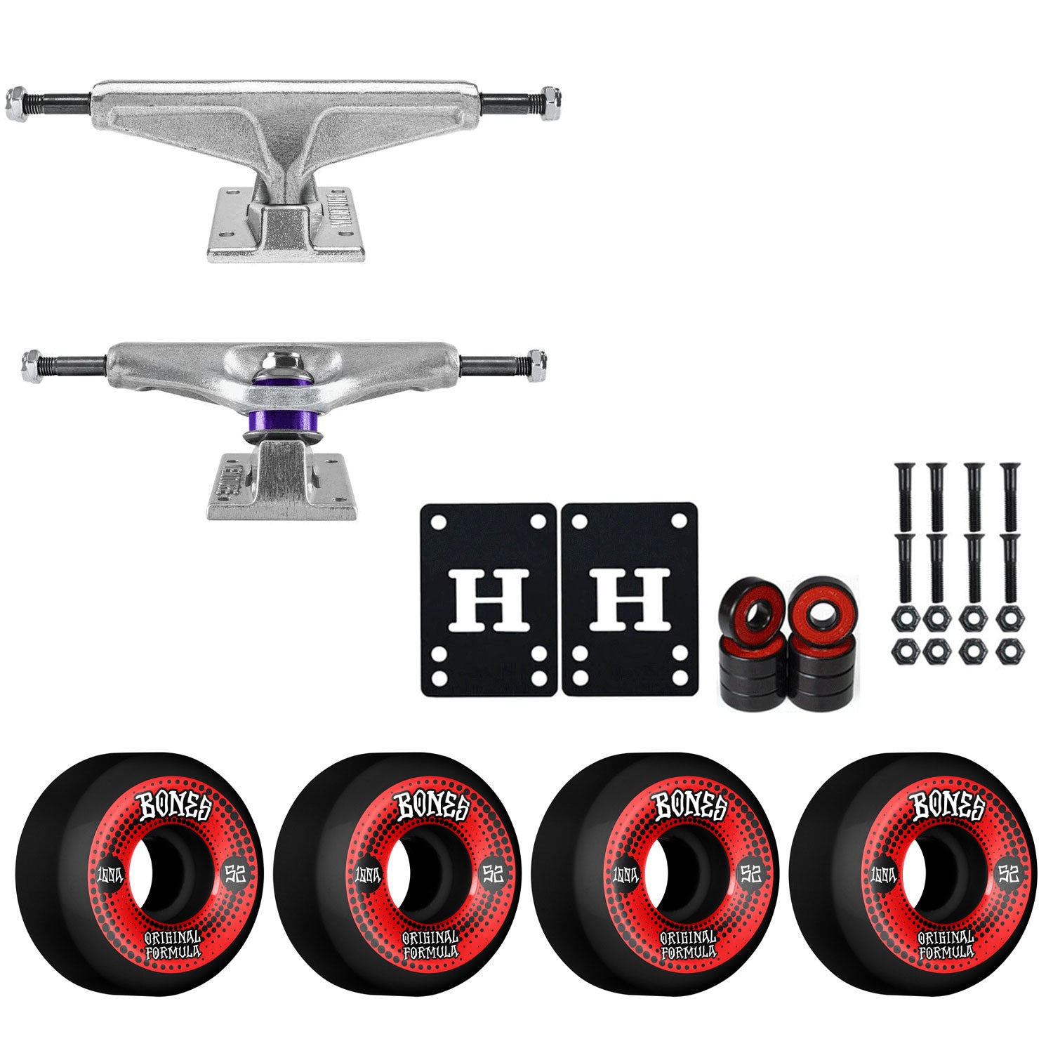 This package contains everything you need to make your deck a complete. Includes a set of Standard Polished Venture Trucks, Bones 100's Wheels, Amp Abec 5 Bearings, 1" Hardware, and 1/8" Riser pads. Just add a deck and griptape and you are ready to ride!