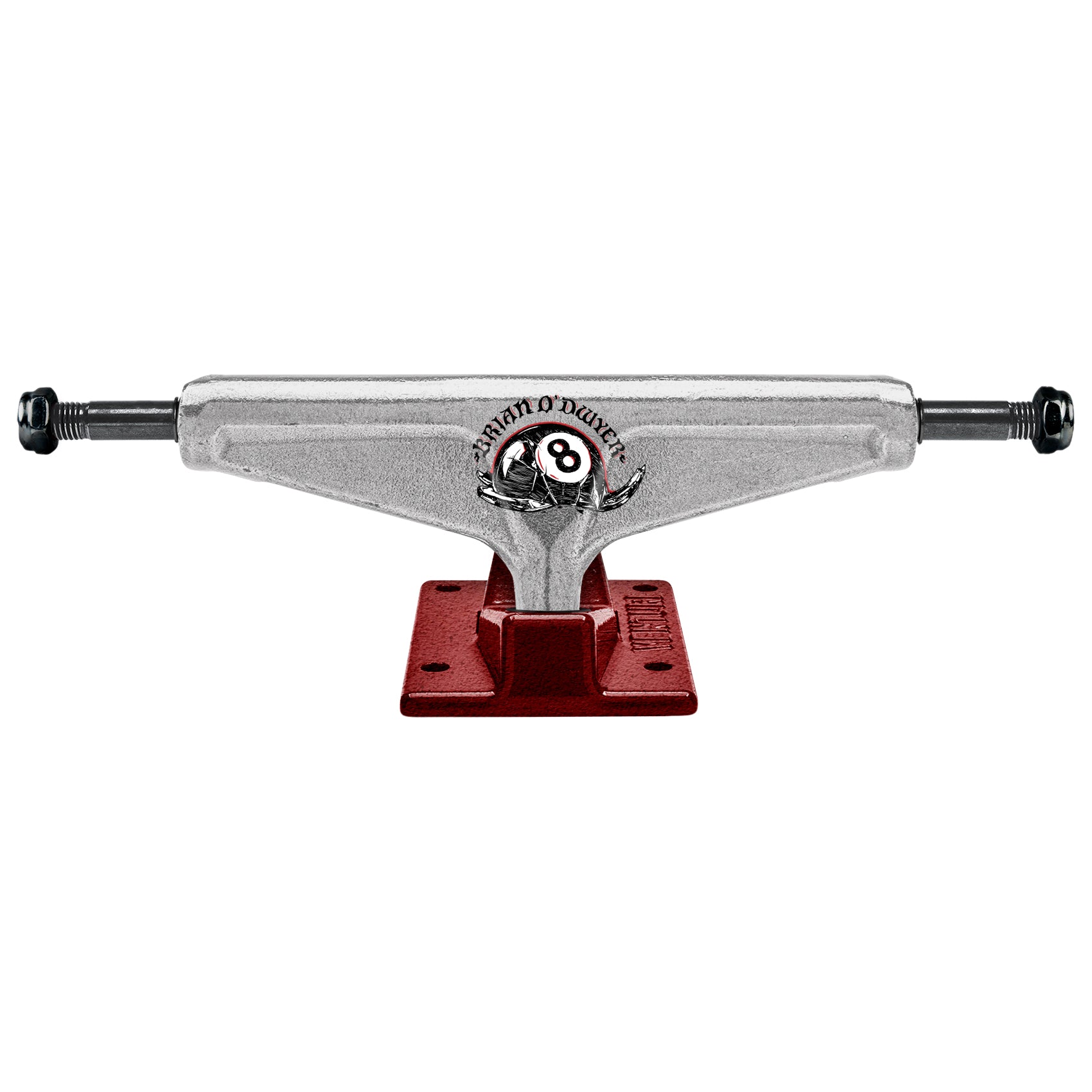 Brian O'Dwyer Pro V-Hollow trucks featuring polished hanger with pad printed graphic and forged textured red powder coat baseplates.