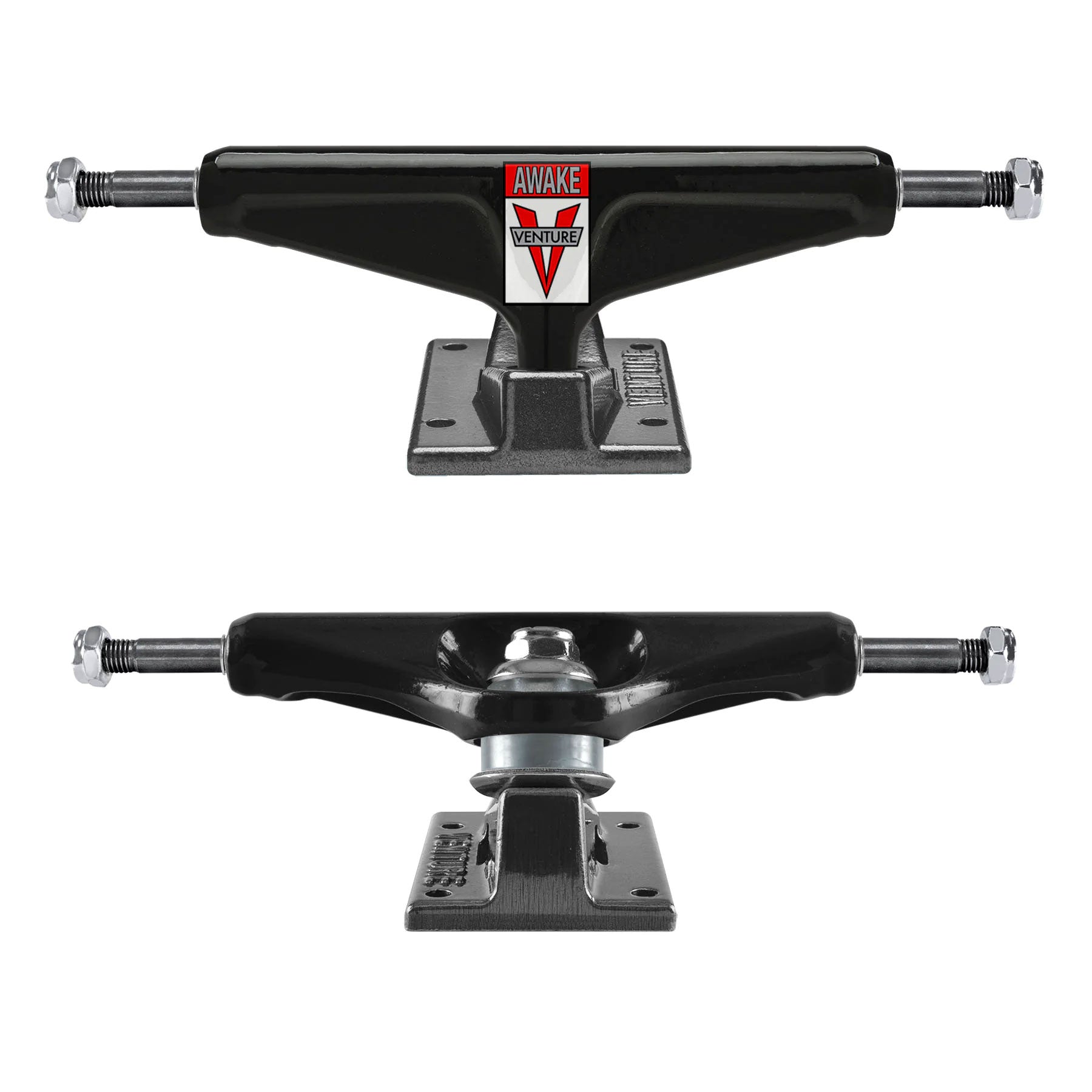 Venture Awake Team Edition Trucks. Gloss black hanger with cast matte black baseplate. Solid axles. Solid kingpins. Clear 90A Venture bushings. Venture 5.6 = 8.25" Axle. Includes 2 Trucks.