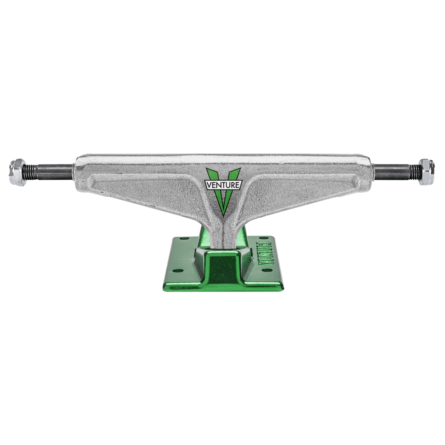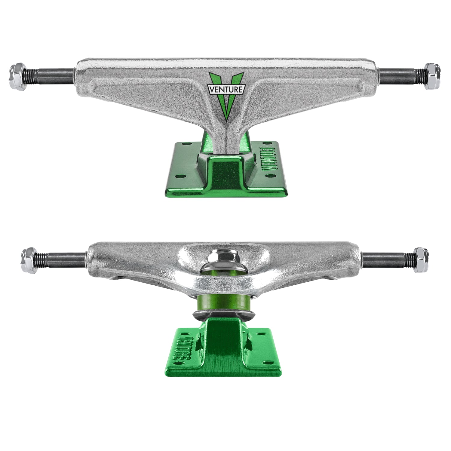 Venture V-Light OG-V Polished/Green. Lightweight by design, ultra quick response & control, premium grade hollow kingpins, custom forged Aluminum baseplate. Hollow Kingpin. Standard Axle. Green Bushings. Venture 5.8 = 8.5" Axle. Includes 2 Trucks.
