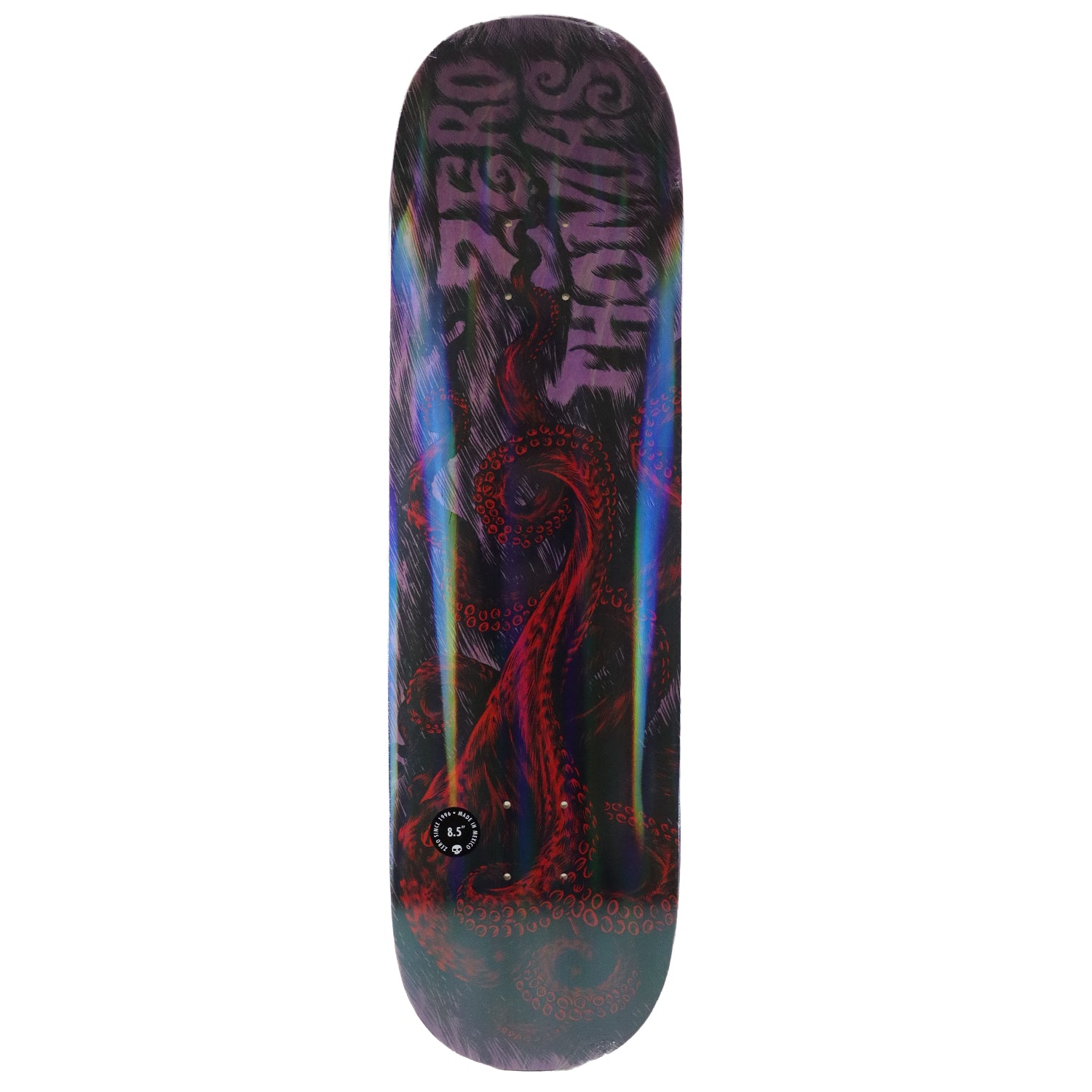 Board comes in assorted color top and bottom plys. Zero decks are constructed with 7-Ply North American Maple. This board measures 8.5" x 32.3" with a 14.5" wheelbase. Features holographic CD foil.